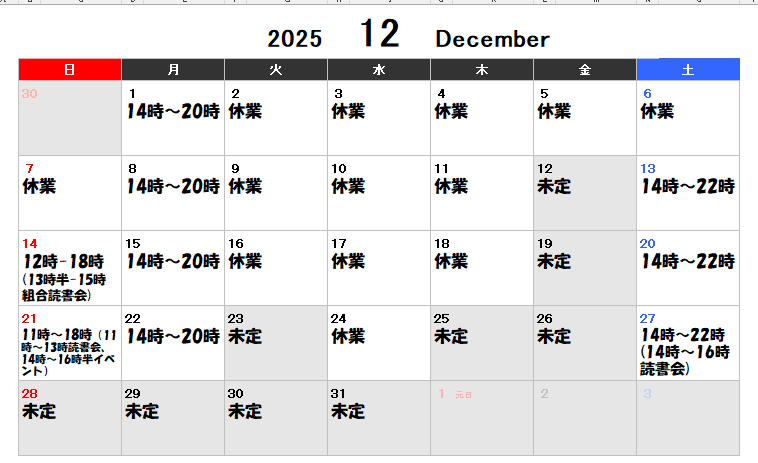 追記 未定になっている12月12日(金)は19時~25時に営業します。