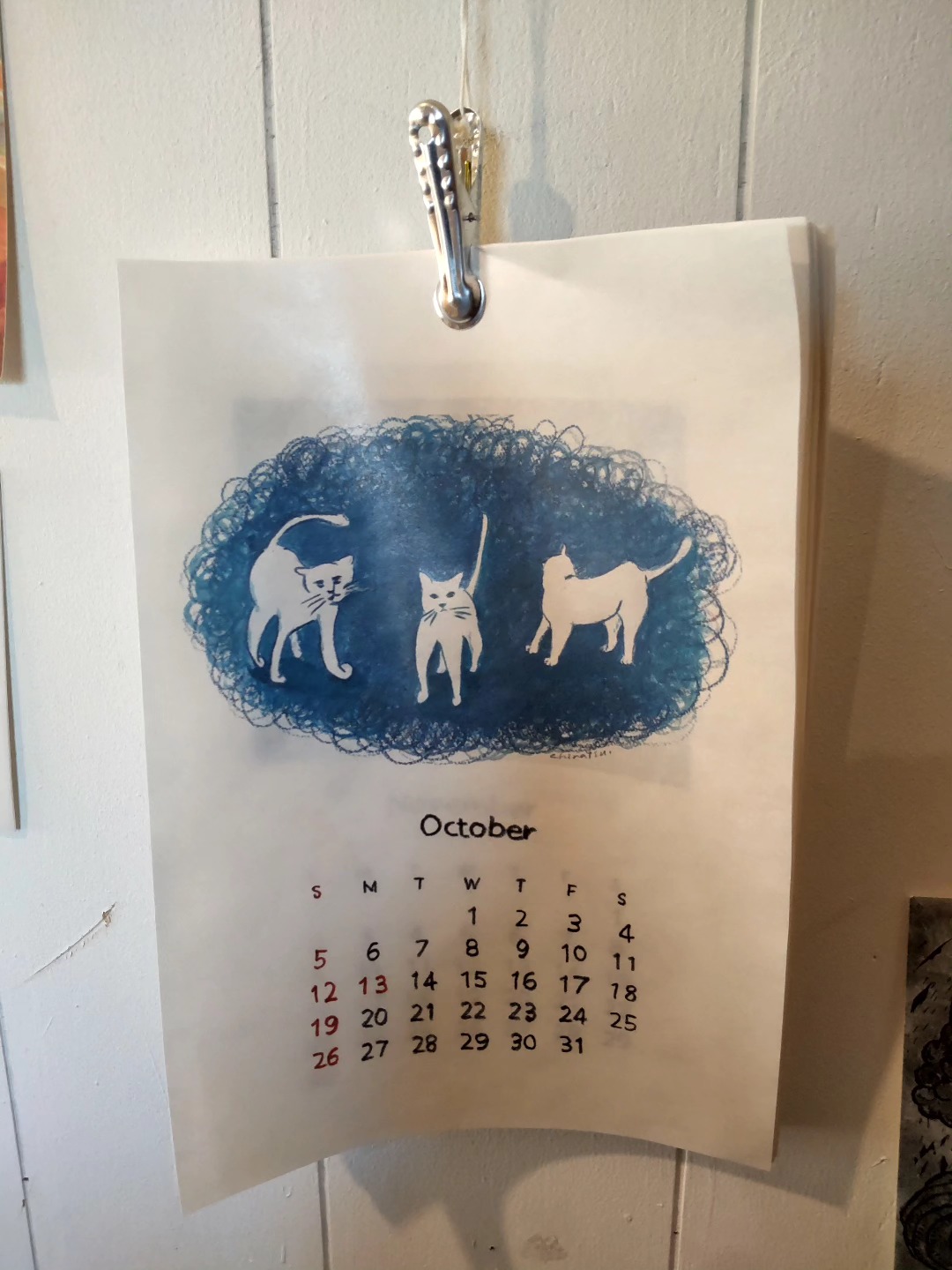 答えを明かすのをもったいぶりすぎて11月になってました。10月も白猫ちゃんです。三匹なわけではなく同じねこちゃんの三ポーズでしょうか。あるいは二匹+どちらかの別ポーズ?私には謎めいた絵です。
