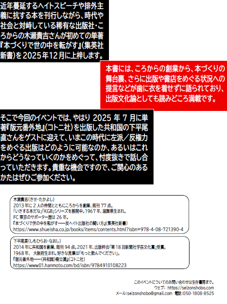 そこで今回のイベントでは、木瀬貴吉さんと、やはり2025年7月に単著『版元番外地』(コトニ社)を出版した共和国の下平尾直さんをゲストに迎えて、いまこの時代に左派/反権力をめぐる出版はどのように可能なのか。あるいはこれからどうなっていくのかをめぐって、忖度抜きで話し合っていただきます。貴重な機会ですので、ご関心のあるかたはぜひご参加ください。