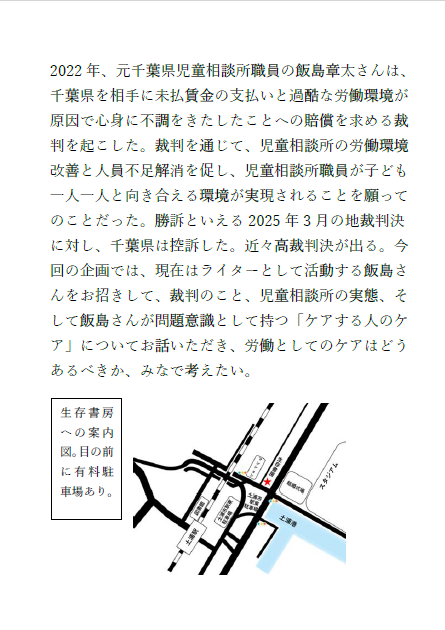 2022年、元千葉県児童相談所職員の飯島章太さんは、千葉県を相手に未払賃金の支払いと過酷な労働環境が原因で心身に不調をきたしたことへの賠償を求める裁判を起こした。裁判を通じて、児童相談所の労働環境改善と人員不足解消を促し、児童相談所職員が子ども一人一人と向き合える環境が実現されることを願ってのことだった。勝訴といえる2025年3月の地裁判決に対し、千葉県は控訴した。近々高裁判決が出る。今回の企画では、現在はライターとして活動する飯島さんをお招きして、裁判のこと、児童相談所の実態、そして飯島さんが問題意識として持つ「ケアする人のケア」についてお話いただき、労働としてのケアはどうあるべきか、みなで考えたい。
