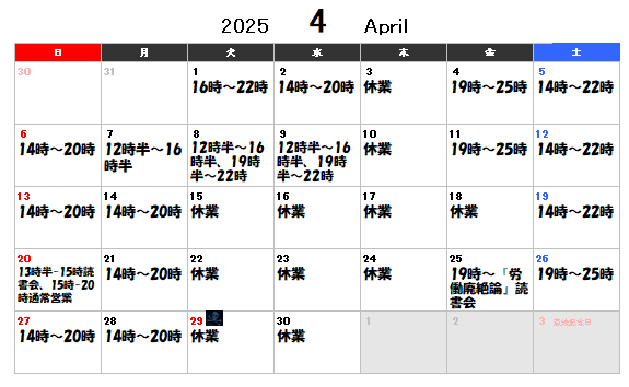 12月1日(月)に営業したあと6連休となります。ご了解ください。