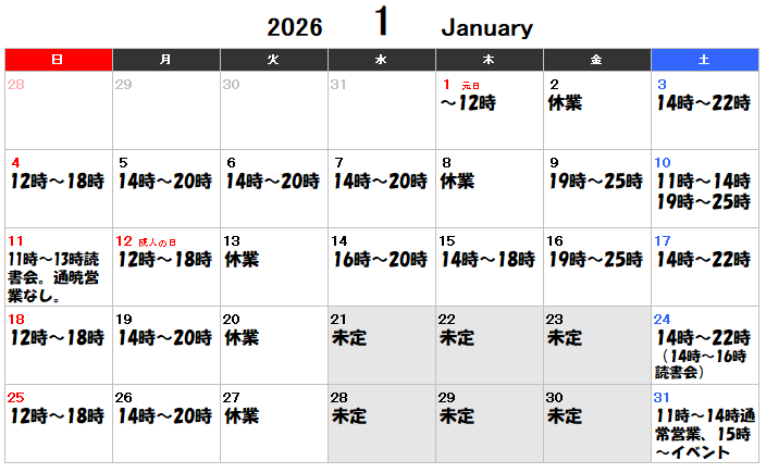 1月の営業カレンダーを更新しました。10日(土)は14時~22時に営業予定でしたが、11時~14時と19時~25時に変更しました。