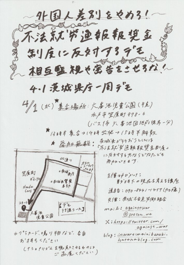 「不法就労通報報奨金制度」に反対する私たちは、この制度をつくろうとしている茨城県庁に抗議の声を届けるデモ行進をしようと思う。ぜひ多くの人の参加と注目を!