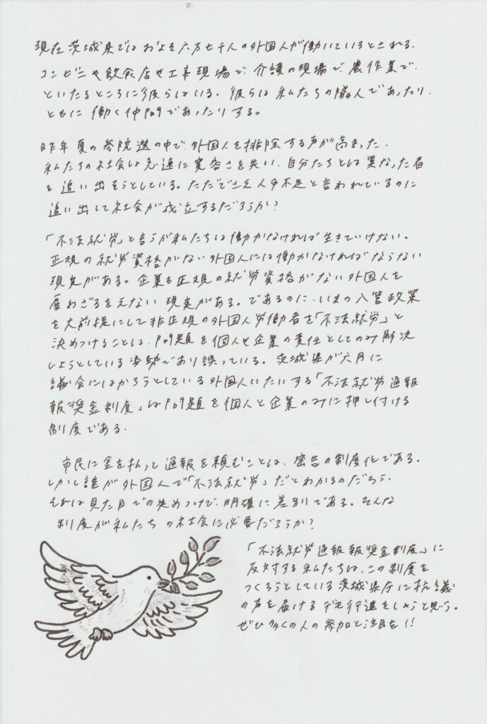 「不法就労」と言うが私たちは働かなければ生きていけない。正規の就労資格がない外国人には働かなければならない現実がある。企業も正規の就労資格がない外国人を雇わざるをえない現実がある。であるのに、いまの入管政策を大前提にして非正規の外国人労働者を「不法就労」と決めつけることは、問題を個人や企業の責任としてのみ解決しようとする姿勢であり誤っている。茨城県が六月に議会にはかろうとしている外国人にたいする「不法就労通報報奨金制度」は問題を個人と企業のみに押し付ける制度である。