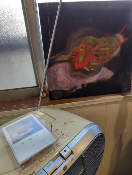 その絵は、聴くものの脳が「もう何もやることがない夏休みの夕暮れ」という言葉に支配されるpottmannのアルバム『ふるさと』のジャケットに使われた森本友さんの作品です。つくば市天久保のPEOPLEBOOKSTOREで昨年末から2月にかけてやっていた森本友作品展の最終日にゲットしました。