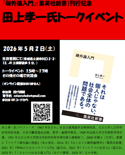 『疎外論入門』(集英社新書)刊行記念 田上孝一氏トークイベント 日時 2026年5月2日(土)15時~。イベント後交流会 会場 生存書房(土浦市川口2-2-12)JR土浦駅近く 入料無料 投げ銭制 要予約 以下からお願いします。
