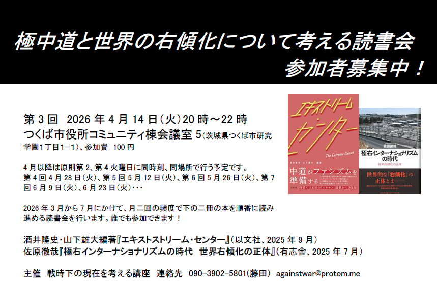 次回の極中道と世界の極右化を考える読書会(『エキセン』読書会) 日時 2026年4月14日(火)20時~22時 場所 つくば市役所コミュニティ棟会議室5 テキスト: 佐々木夏子「メディアとマクロン」 アルベルト・トスカーノ/酒井隆史訳「レイト・ファシズム」 菊地夏野「フェミニズムをめぐる困難と希望」