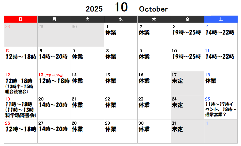 25日(土)に究極Q太郎さんを招いてのイベントがあります。先月よりも休業が多めです。