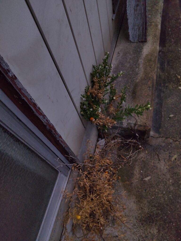 それをいうなら、元気なのにはたくさん実がついているのですよね。なんとか生き延びたのにも、枯れてしまったたのにも8月までは実がついてたはずですが、いつの間にかほとんど落としてしまったようです。なので生き延びた株はむしろ生き延びて再度花を咲かせる力を得たということなのでしょうか。