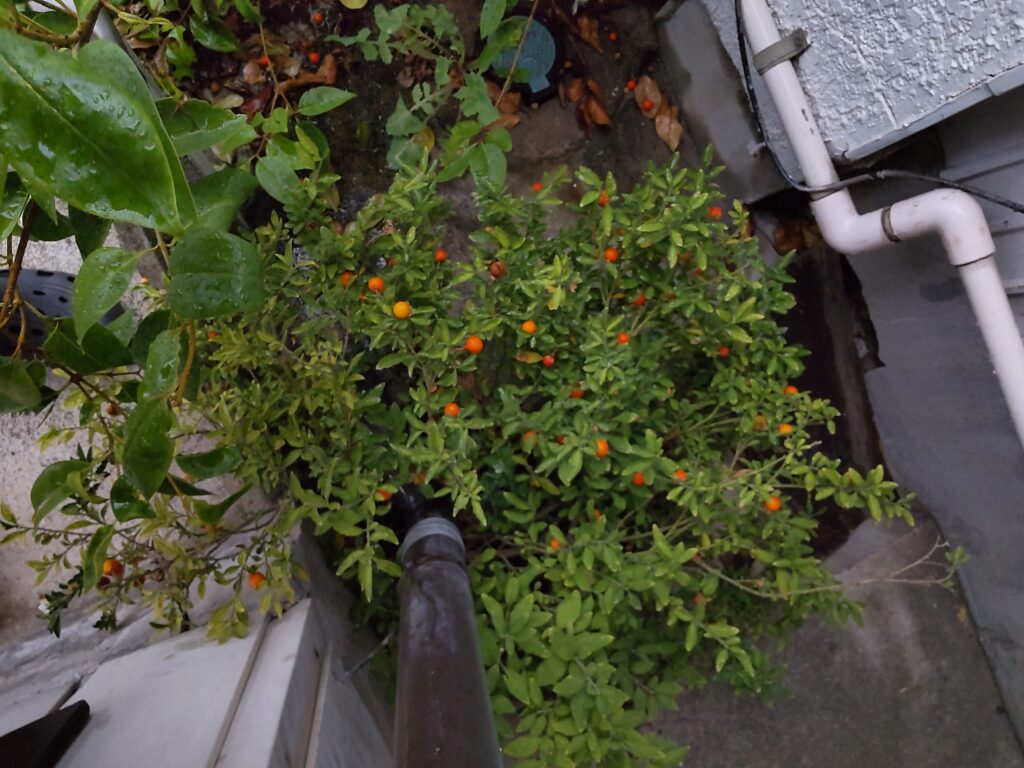 先ほど気づいたのですが、三株のタマサンゴのうち、一株は猛暑・少雨で枯れてしまい、一株は枯れかけましたがなんとか生き延び、一株は元気に繁茂しています。そしてなんとか生き延びた一株はやたら花がついてます。もし枯れるなら実だけは残そうとしたのでしょうか。