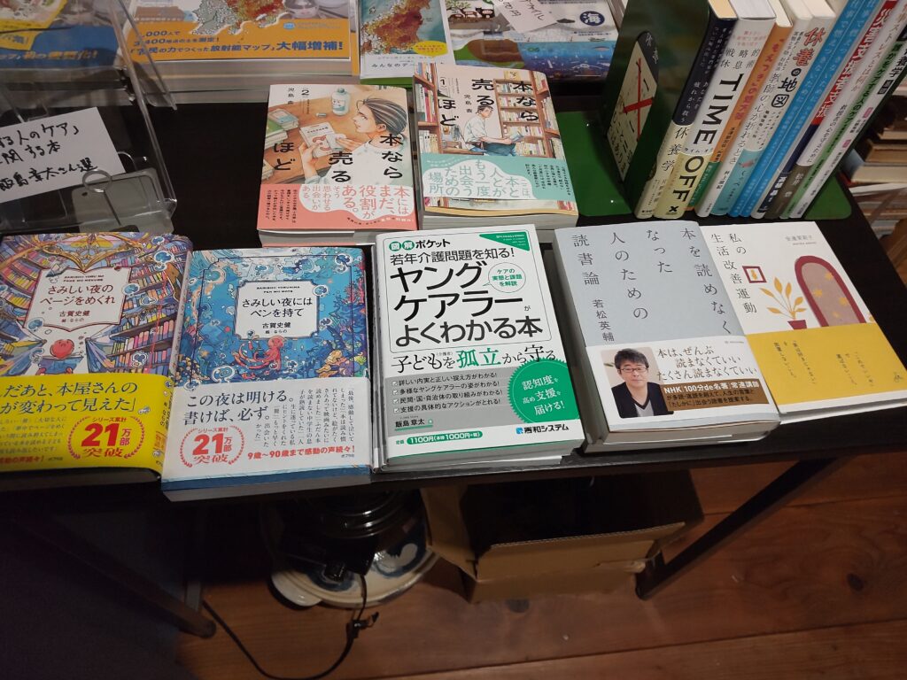 飯島章太さん選書の「ケアする人のケア」に関する本コーナーは引き続き店の一角で続けます。