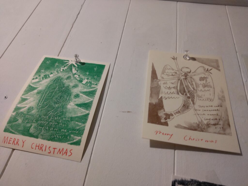 ラジオからクリスマスソングが流れてくるのを聴いています。写真は鎚谷紗希さん作クリスマスカード。左が2024年の、右が2025年の今年の。今年のは一月くらい前に千年一日珈琲焙煎所cafeでゲットしました。