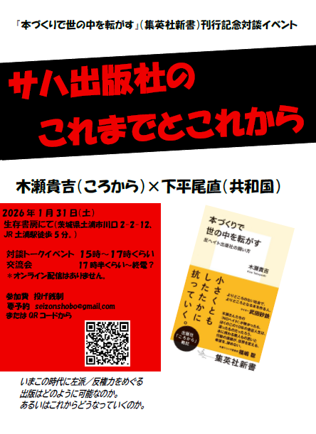 なんと、2026年1月31日(土)に、ころからの木瀬貴吉さんと共和国の下平尾直さんの対談イベント「サハ出版社のこれまでとこれから」を生存書房でやります!