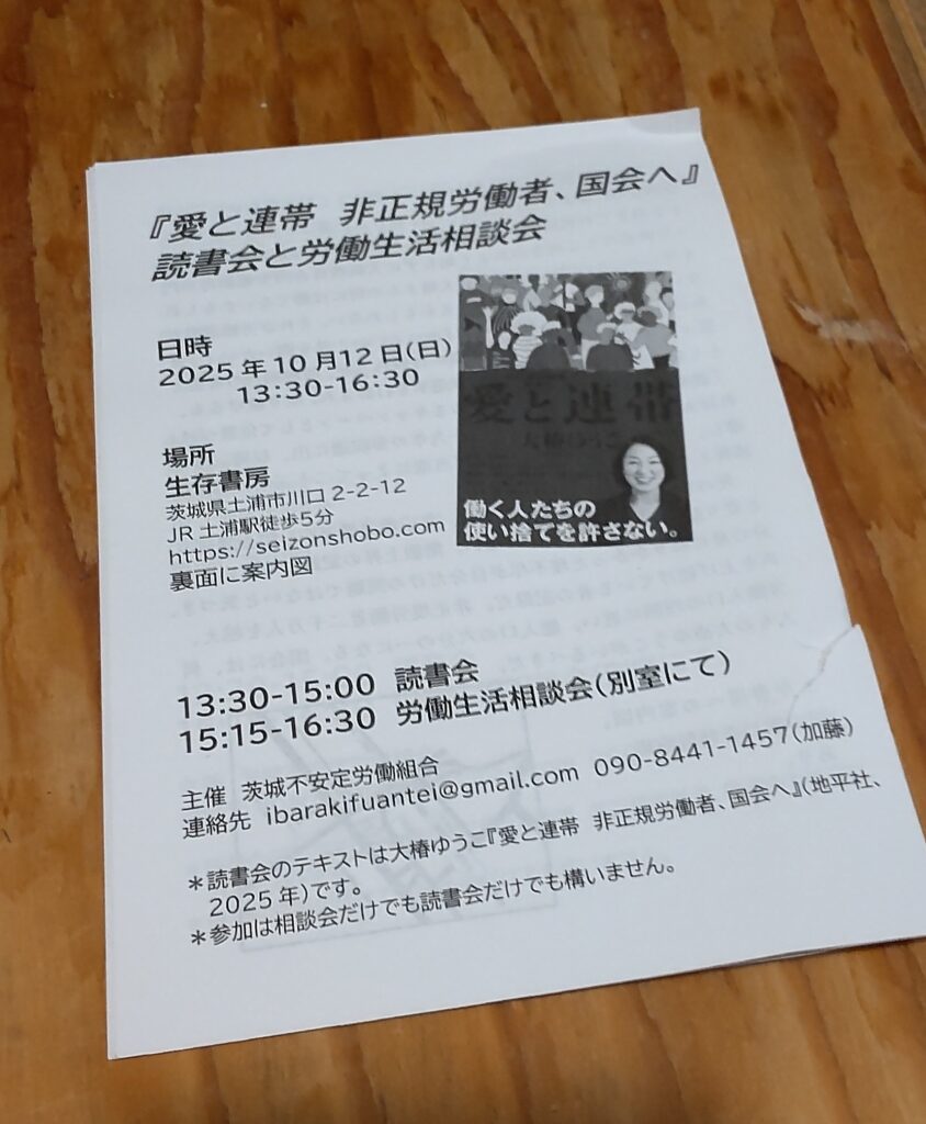 10月12日(日)は当店で茨城不安定労働組合の読書会と労働生活相談会があります