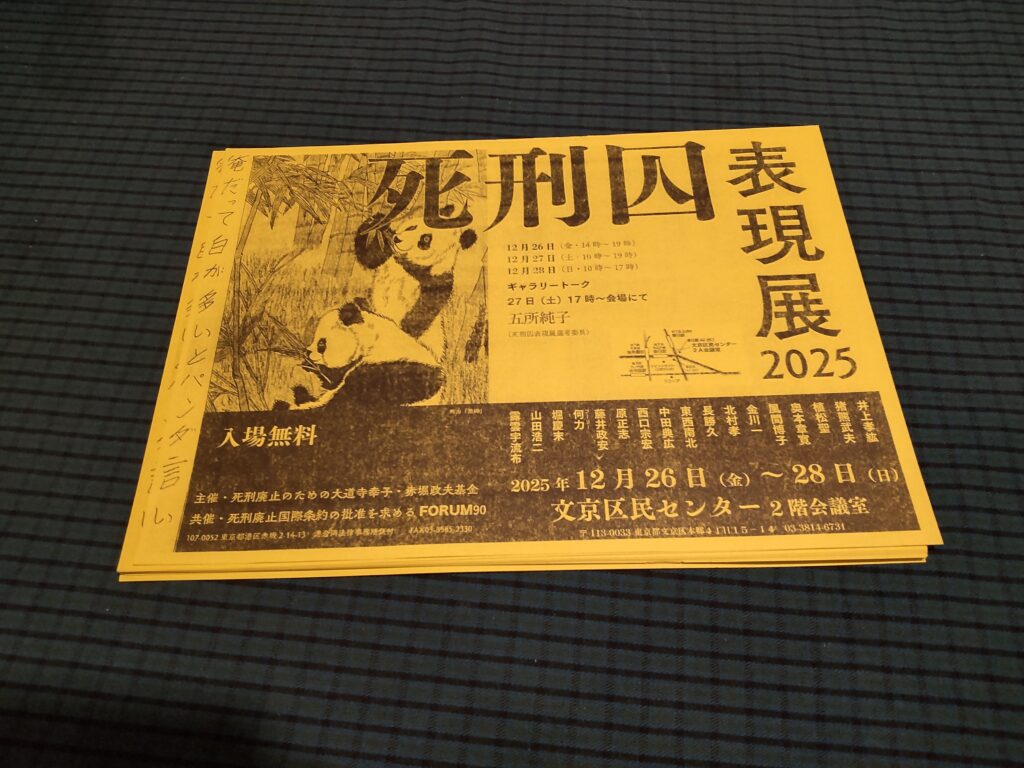 投稿日: 2025年12月27日2026年1月3日 投稿者: m88chcdw死刑囚表現展 「死刑囚表現展2025」@文京区民センター、2025年12月26日(金)~28日(日) この前お客さんが持ってきたチラシです。残念ながら私は行けませんが、行ける人は行ってください。