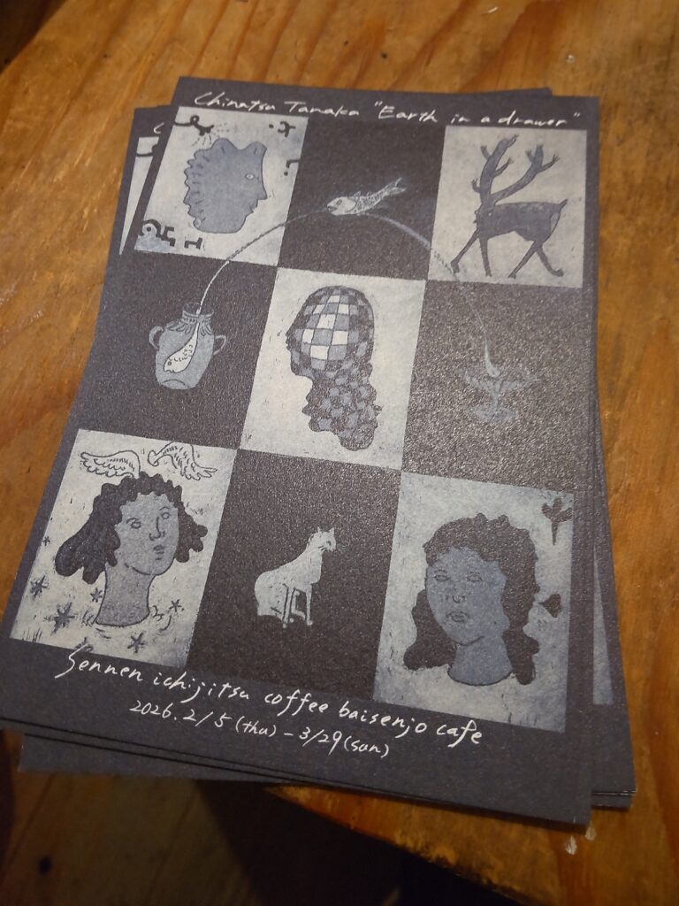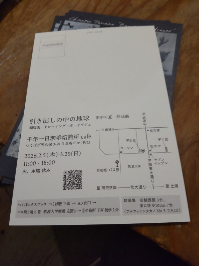 田中千夏さんといえば、来年つくば市天久保の千年一日珈琲焙煎所cafeで作品展をやられるそうです。今日、千年一日珈琲焙煎所で珈琲豆を買ったときに告知用のポストカードをもらいました。